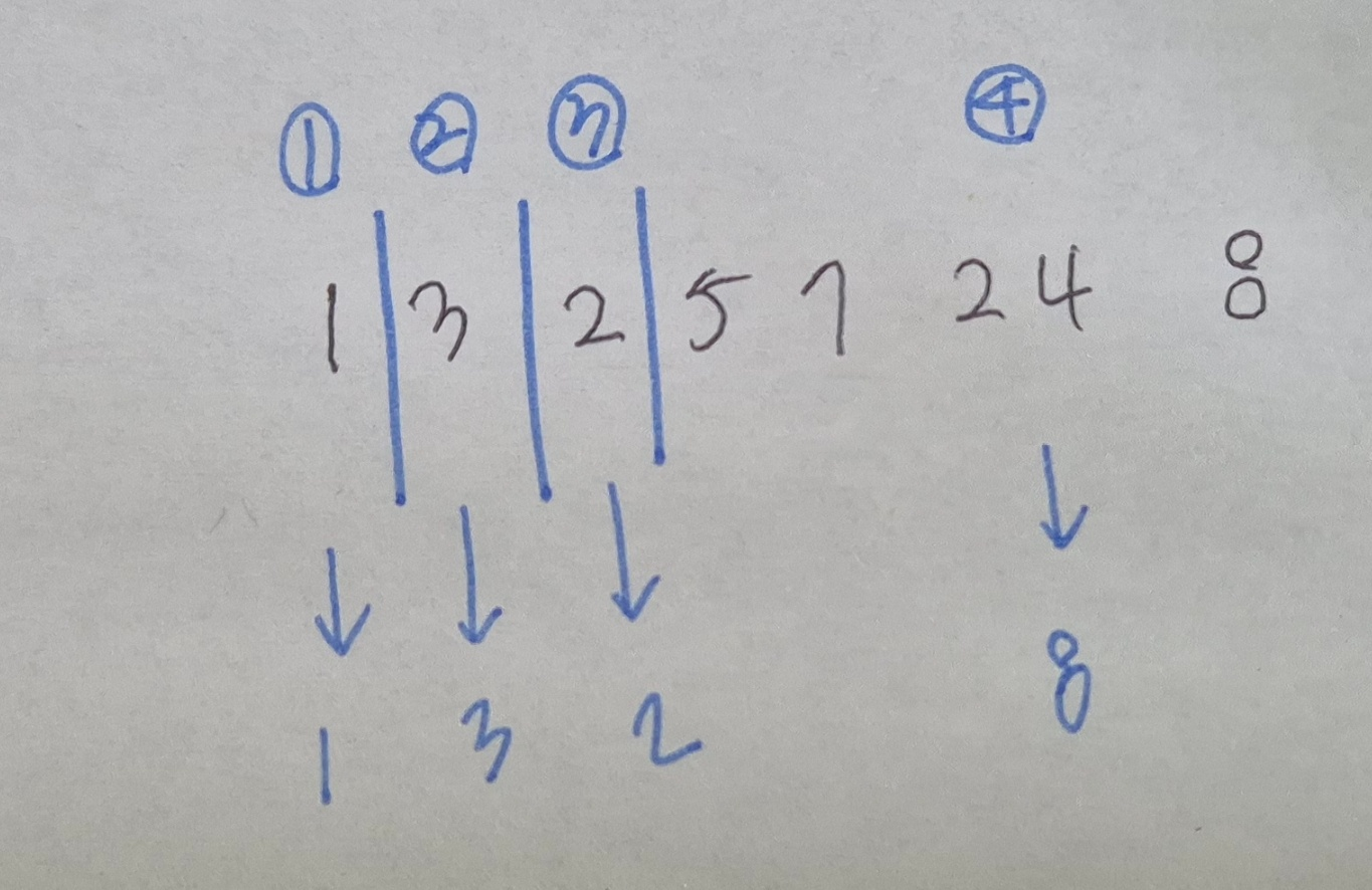 ์๋ฅผ ๋ค์ด [1,3,2,5,7,2,4,8] ์ d = 4 ์ผ๋์ ๋๋ ์ ์ฒ๋ฆฌํ๋ ์์๋ฅผ ์๊ฐํด๋ณด๊ฒ ์ต๋๋ค.