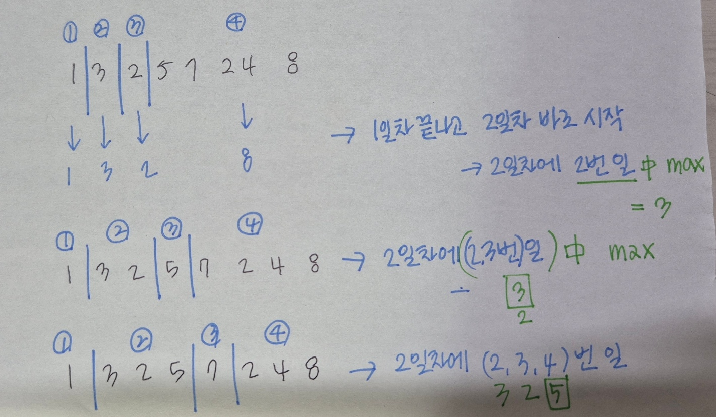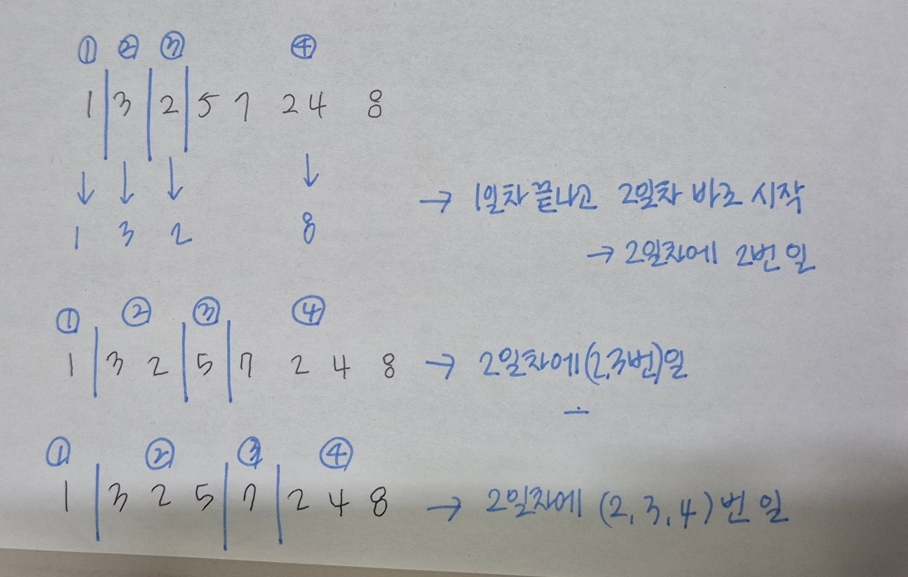 ๋ฌธ์ ์์ ์์๋๋ก ์ผ์ ์งํํด์ผ ํ๋๋ฐ, ๋งค์ผ ์ต์ 1๊ฐ ์ด์์ ์์