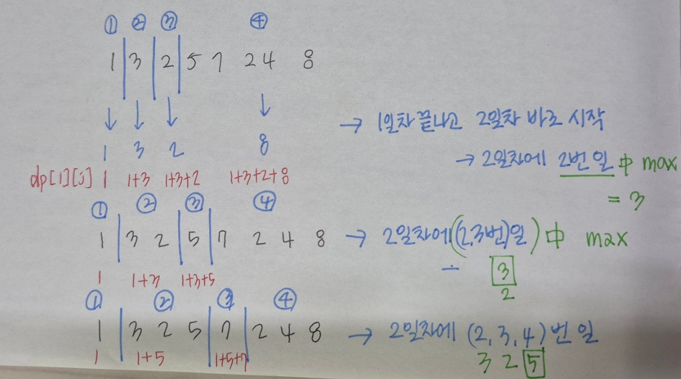 dp[i][j]์๋ i์ผ์ j๋ฒ์งธ ๊น์ง ์ผ์ ํ์ ๋ ์์๋๋ ์ต์ ํฉ ์ผ๋ก ํ๊ฒ ์ต๋๋ค