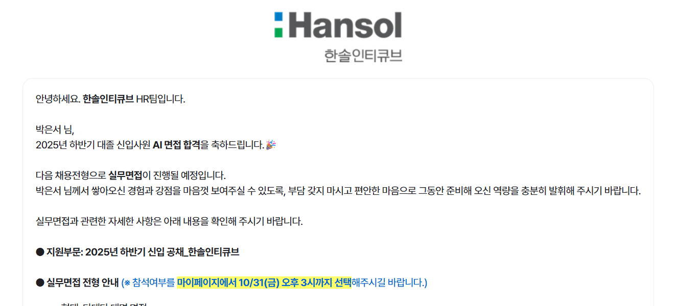 10μ 24μΌ μλ₯ ν©κ²© λ©μΌμ΄ μμ΅λλ€. μ½λ© ν μ€νΈ μ νμ΄ μκ³ λ°λ‘ AI λ©΄μ μ΄μμ΅λλ€.