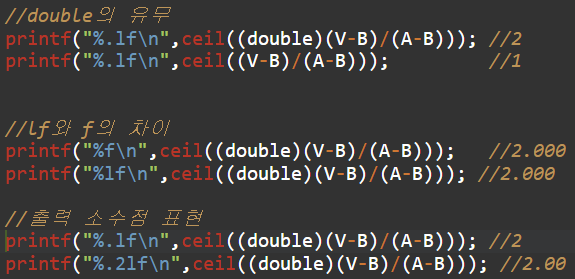 double๋ก ํ๋ณํ์ ์ํ๋ฉด V,A,B ๋ชจ๋ int๊ธฐ ๋๋ฌธ์ 1.25๊ฐ ์๋๋ผ 1์ด ๋๋ค. 1์ ceil๋ก ์ฌ๋ฆผํ๋ฉด ๊ทธ๋๋ก 1์ด๋ค.