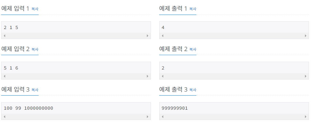 ์ฒซ์งธ ์ค์ ์ธ ์ ์ A, B, V๊ฐ ๊ณต๋ฐฑ์ผ๋ก ๊ตฌ๋ถ๋์ด์ ์ฃผ์ด์ง๋ค. (1 ≤ B < A ≤ V ≤ 1,000,000,000)