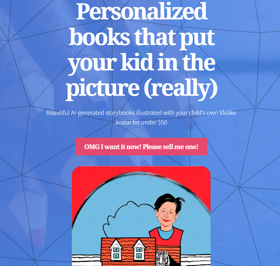 - 올해 12월 초 런칭! 월 33불 수익 기록 중. 어린이 책 주인공 이름을 자녀의 이름으로 바꿔주는 서비스! 동화책 속 주인공 이름이 우리 자녀의 이름인 것임. 안 좋아할 수가 없을 듯. 앞으로가 기대되는 서비스!