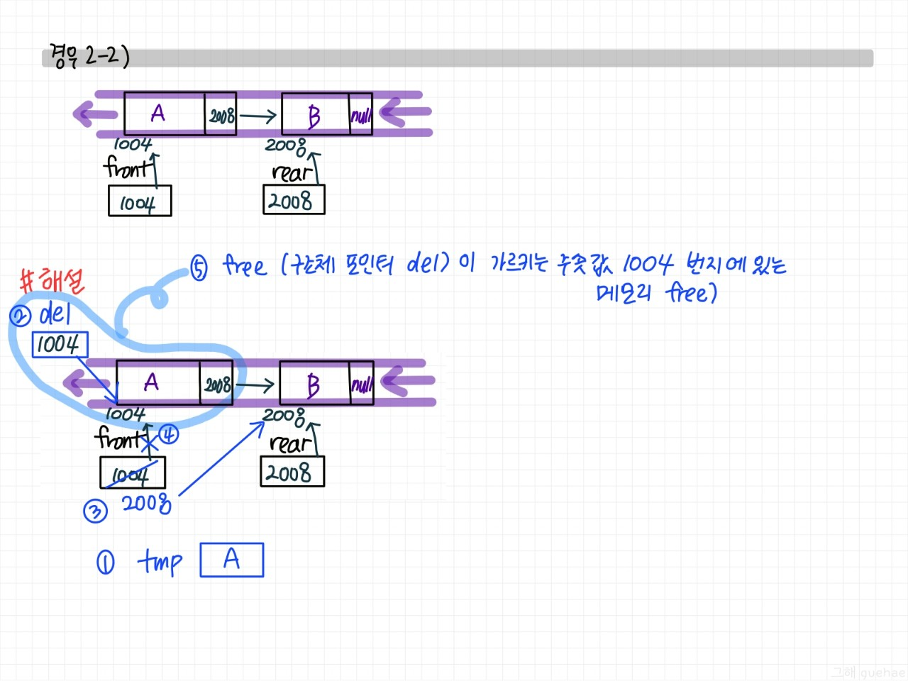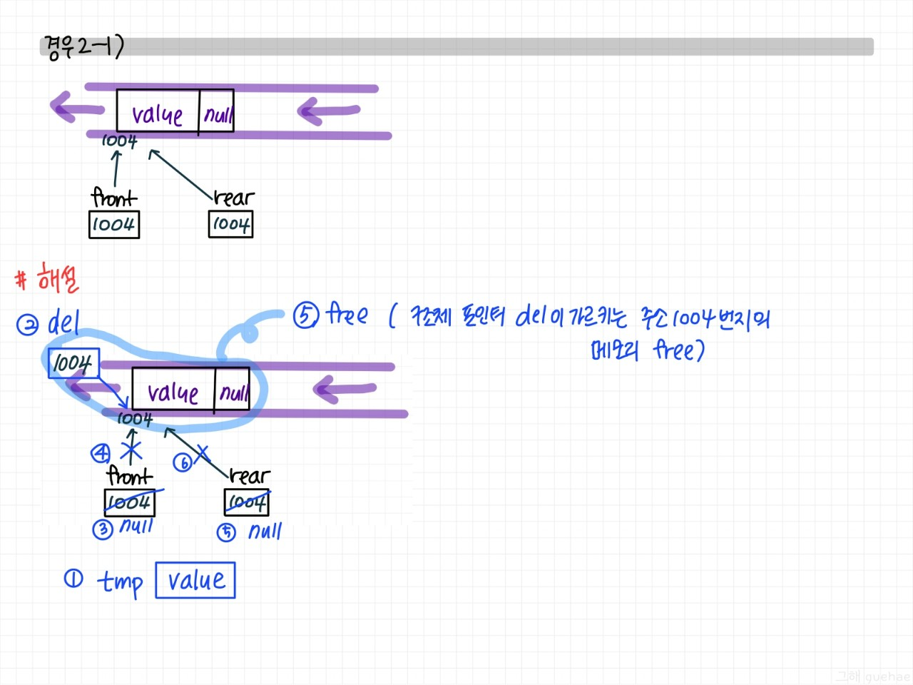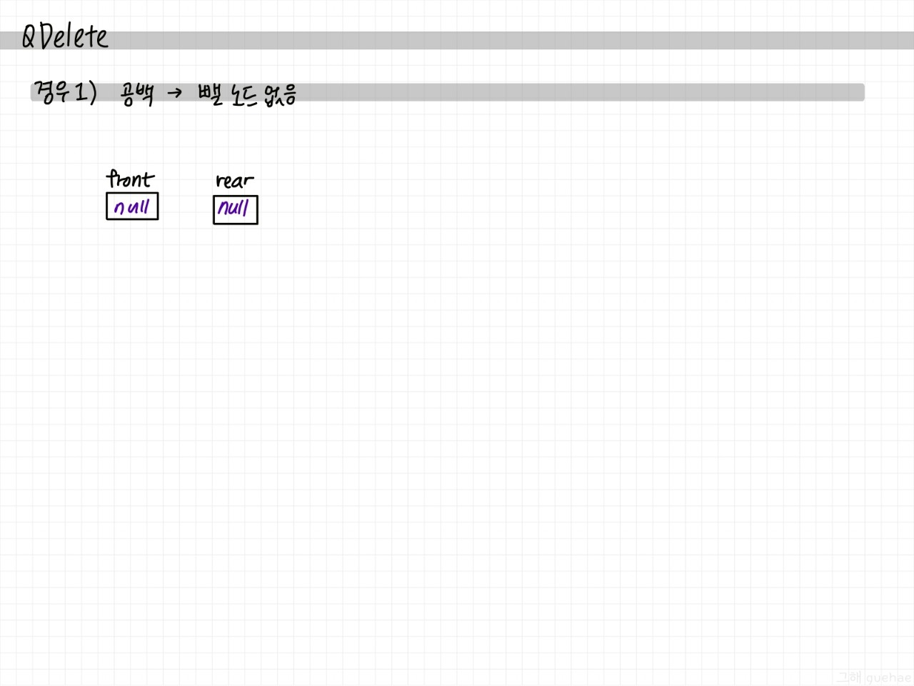 printf("%d\n",qdelete()); // front: null, rear: null (1๋ฒ์ง free) (null)