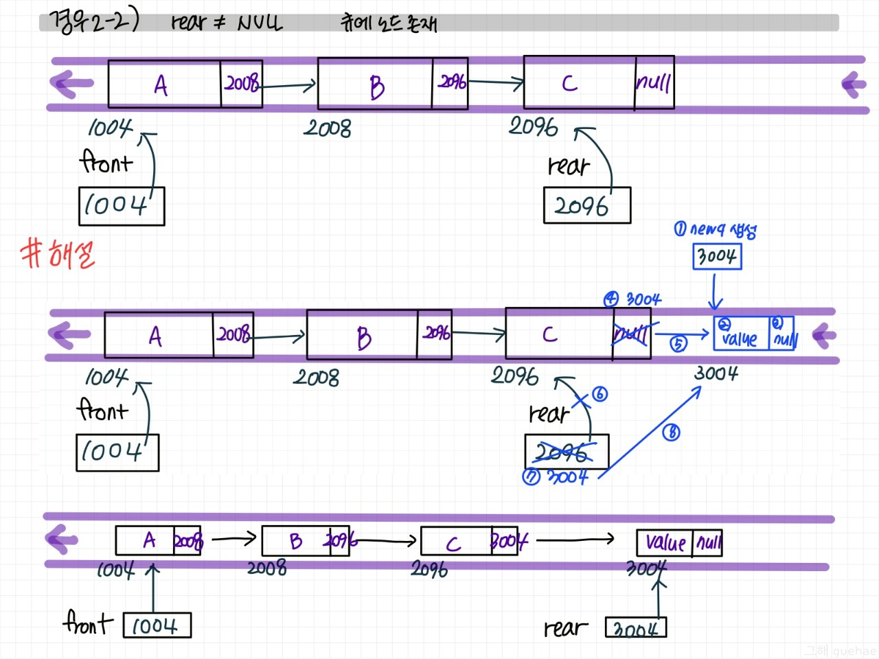 //rear์ link๊ฐ ์๋ก์ด newq์ ์ฃผ์๊ฐ ๊ฐ๋ฅดํด